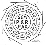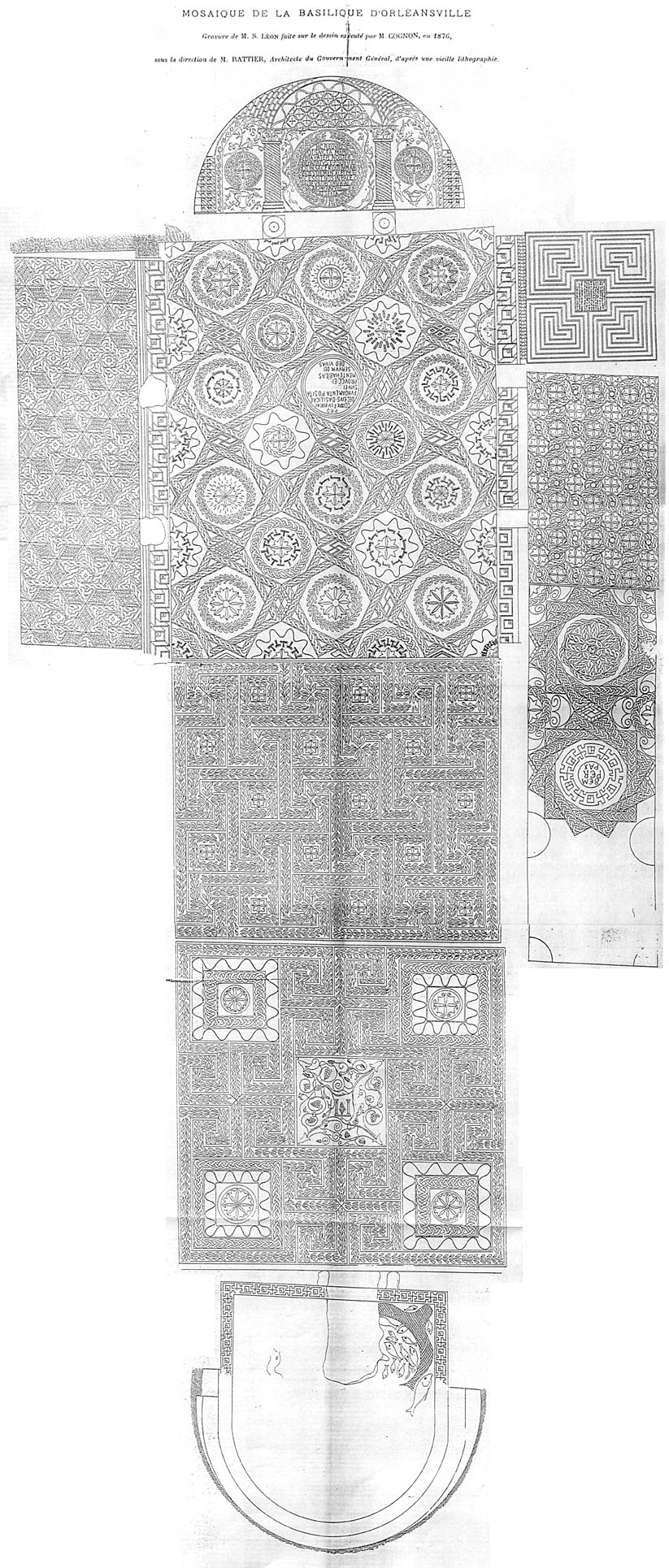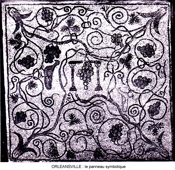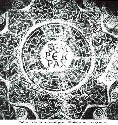 dans l'antique basilique. Nous foulons de splendides mosaïques. Ce n'est pas un pavage composé seulement de frises et de figures géométriques aux couleurs chatoyantes et aux volutes harmonieusement disposées, c'est aussi un ensemble de tableaux et de motifs bordés de frises de feuilles de laurier qui, tout à la fois, pris séparément et dans leur ensemble, sont destinés à faire passer un message de paix, universalité de l'Eglise catholique, appartenance des chrétiens d'Orléansville au culte catholique. On peut voir, pêle-mêle : Près de la porte latérale Nord, le fameux labyrinthe dont le centre est occupé par les mots ''SANCTA ECLESIA'' (La Sainte Eglise). Un peu plus haut, dans une rosace, encadrée de torsades, est inscrite la devise ''SEMPER PAX '' (Toujours la Paix). Ceci nous avertit que l'Eglise dont font partie les chrétiens de CASTELLUM TINGITANUM est l'Eglise Catholique. Dans la nef principale, le pavement représente le tableau d'un édifice à 3 nefs dont les voûtes sont soutenues par 2 colonnes torses. Les espaces vides sont occupés par 3 couronnes de lauriers. Des chrismes floraux occupent le centre des couronnes. Ce sont des croix ornementales. On sait que les chrétiens des premiers siècles évitaient de faire figurer trop nettement la croix par crainte de profanations. Il s'agit là de la mémoire ou chapelle-reliquaire des Saints Apôtres Pierre et Paul. Côté Est, une série de 11 couronnes de laurier entourant une inscription. Les spécialistes y voient une allusion aux apôtres : les trois couronnes de lauriers précédentes seraient une référence au Christ entouré de Pierre et Paul (lequel ne faisait pas partie des 12 apôtres, bien qu'il participa activement à la diffusion de l'Evangile) et les 11 ci-dessus symbolisant les autres apôtres. Vers le milieu de la nef, un carré d'environ 6 mètres de côté est entièrement occupé de feuilles de laurier qui naissent en forme de croix, d'une croix lumineuse, et retournent à la croix un peu plus loin. En approchant de l'abside, on retrouve la feuille de laurier et, au centre, un grand carré de 2,10 m de côté dont la décoration est empruntée à la vigne. En montant les degrés qui conduisent à l'abside du fond de la basilique, nous entrons dans la partie réservée au clergé. Un jeu de lettres formé des mots ''MARINUS SACERDOS'' (Marin évêque) analogue à celui qui figure au centre du labyrinthe, indique que pour avoir le droit d'entrer dans le sanctuaire, les clercs doivent être en communion avec l'Eglise catholique. Une bordure dont le dessin compliqué et la couleur rappellent celle qui entoure la devise ''SEMPER PAX'' fait le tour de l'abside. |
