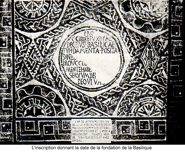 L'AN DE LA PROVINCE 285 (324 AP JC) LE 12 DES CALENDES DE DEC (20 NOV) LES FONDEMENTS DE CETTE BASILIQUE ONT ETE POSES ET L'AN DE LA PROV 290 (329) SOUVENEZ VOUS DE SERVITEUR DE DIEU ET VIVEZ EN DIEU...