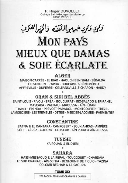 Roger (Père) Proverbes et dictons arabes Mon pays mieux que DAMAS et soie écarlate Mémoire d'ALGERIE et SAHARA En AFRIQUE du Nord de papa Ainsi que plusieurs ouvrages à compte d'auteur sur l'ALGERIE et le SAHARA. Les presses de LIDAG, NOIDANS-LES-VESOUL. |